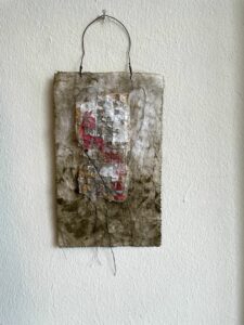 Titel: Keeping it Together (wandobject) afmeting 25×30 cm materiaal; stof, papier, boomschors, wax, ijzer, pigment €585,-